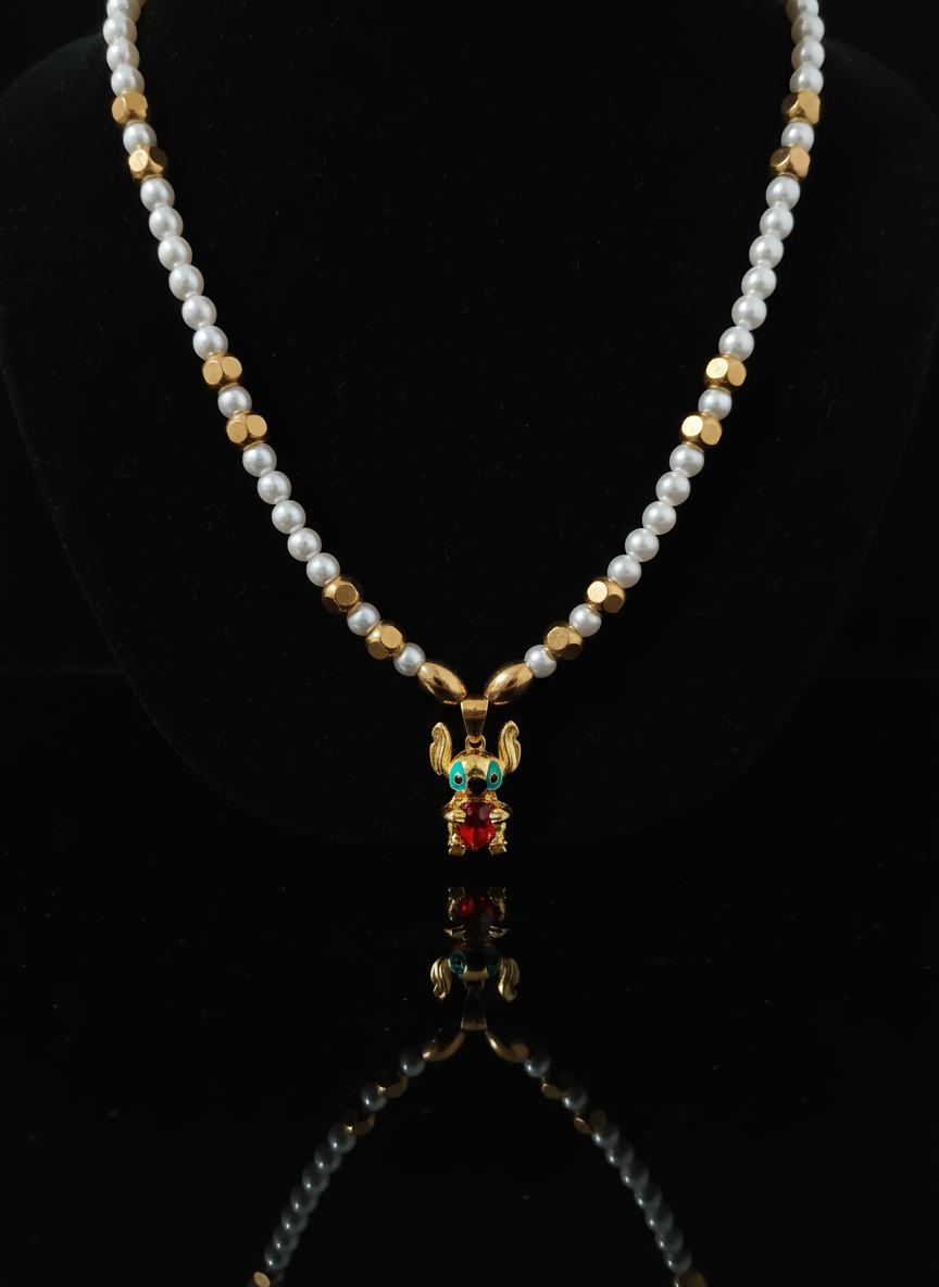 Materiali: perle sintetiche di alta qualità, dettagli dorati e pendente in lega metallica con smalto colorato e cristallo rosso centrale.